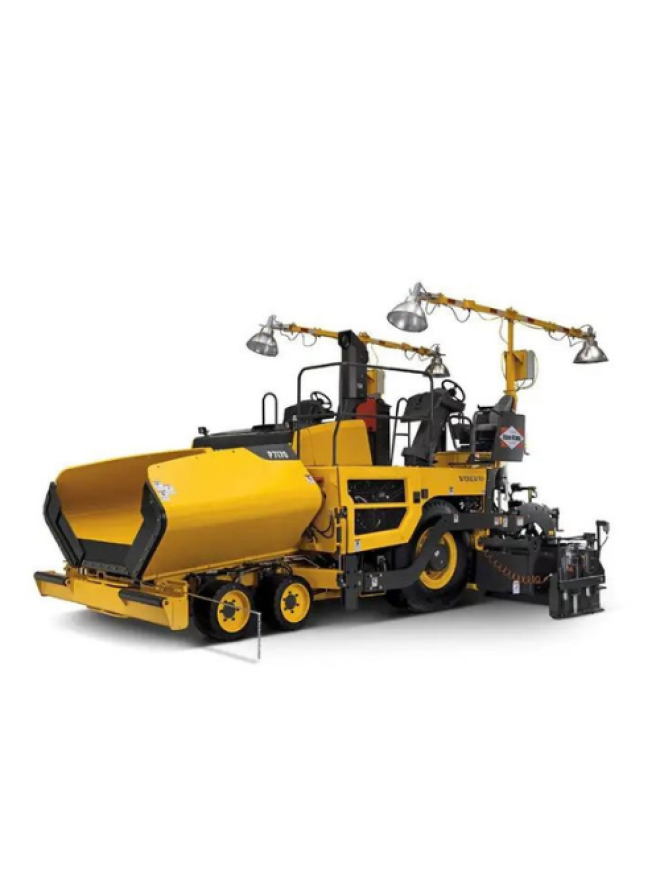 Volvo 7000 Series have been upgraded to Tier 4-Interim compliance with 235-horsepower Volvo D8 engines. The tracked version has continuous rubber track with tandem bogie system. The wheeled Marketed with the Blaw-Knox label, the pavers have a four-sensor feed system that automatically regulates the delivery and flow of material to match paver speed. By pressing a button, the driver and screed operator can extend hydraulically powered, two-stage tunnels that control material flow across the paving width. Blaw-Kote protective coating prevents asphalt from sticking to vital components.